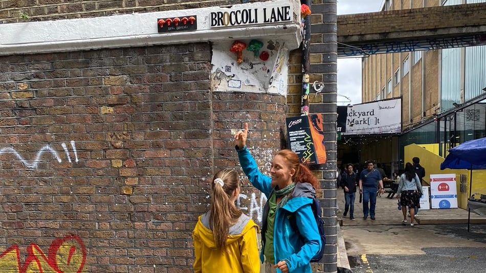 Holen wir buntes Gemüse nun aus London? Nein, keine Sorge - Buntgemüse kommt weiterhin von unserem kleinen Feld. Aber Sabines geschärftem Blick sind die buntgefärbten brokkoliförmigen Kunstobjekte in der Londoner Brick Lane nicht entgangen, während sie endlich Zeit mit ihren beiden Töchtern verbringen konnte.