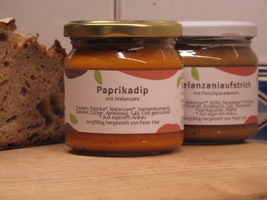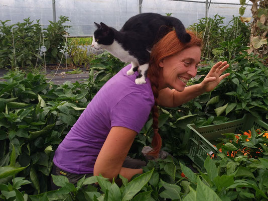 Vor einigen Wochen sind wir im Newsletter ein Bild unserer beiden Feld-Katzen schuldig geblieben. Hier ist endlich eines: Bella stört durch einen beherzten Sprung auf Sabines Rücken bei der Ernte. Trotzdem ist es uns gelungen, die Paprika verarbeiten zu lassen. Peter Hiel, Hersteller vegetarischer Feinkost, hat daraus einen cremigen Dip mit angenehmer Chilischärfe und vor allem dem Geschmack vollreifer Paprika gemacht.